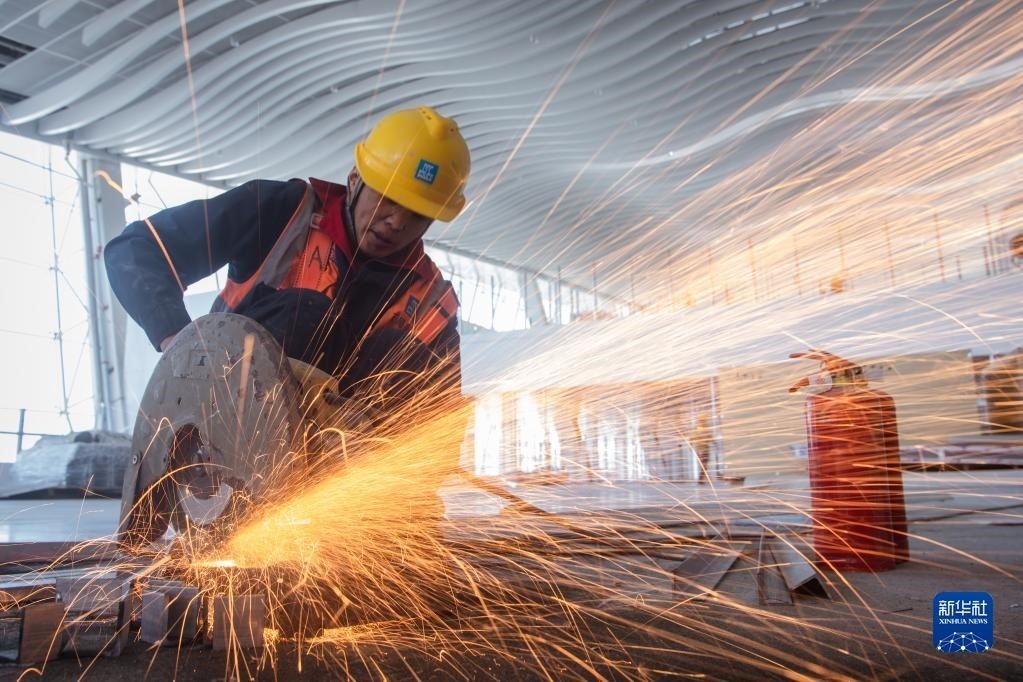 5月1日,在中建三局承建的武漢天河機(jī)場T2航站樓改造工程項目工地,工人在切割材料。