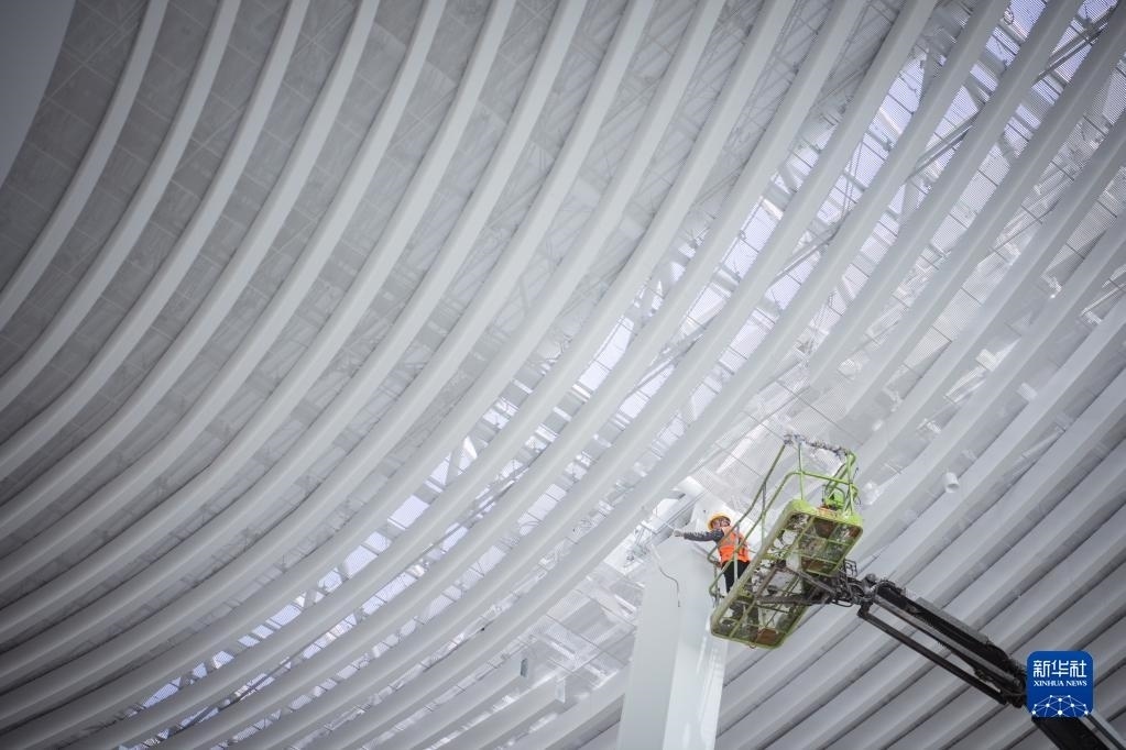 5月1日,在中建三局承建的武漢天河機(jī)場T2航站樓改造工程項目工地,工人在檢查吊頂內(nèi)管線。