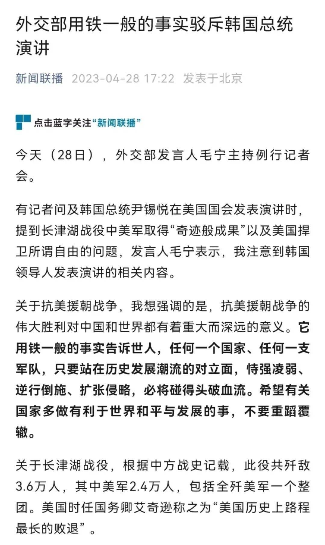 根據(jù)外媒報(bào)道,韓國(guó)總統(tǒng)4月27日在美國(guó)國(guó)會(huì)發(fā)表演講稱(chēng),美國(guó)海軍陸戰(zhàn)隊(duì)第一師在長(zhǎng)津湖戰(zhàn)役中取得了所謂的“奇跡般成果”。