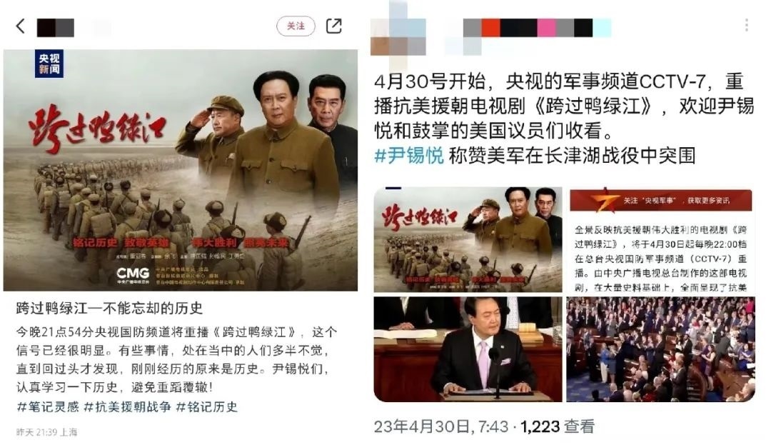 4月29日,中央廣播電視總臺(tái)發(fā)布預(yù)告:電視劇《跨過(guò)鴨綠江》自4月30日起每晚22點(diǎn)檔在央視國(guó)防軍事頻道重播。