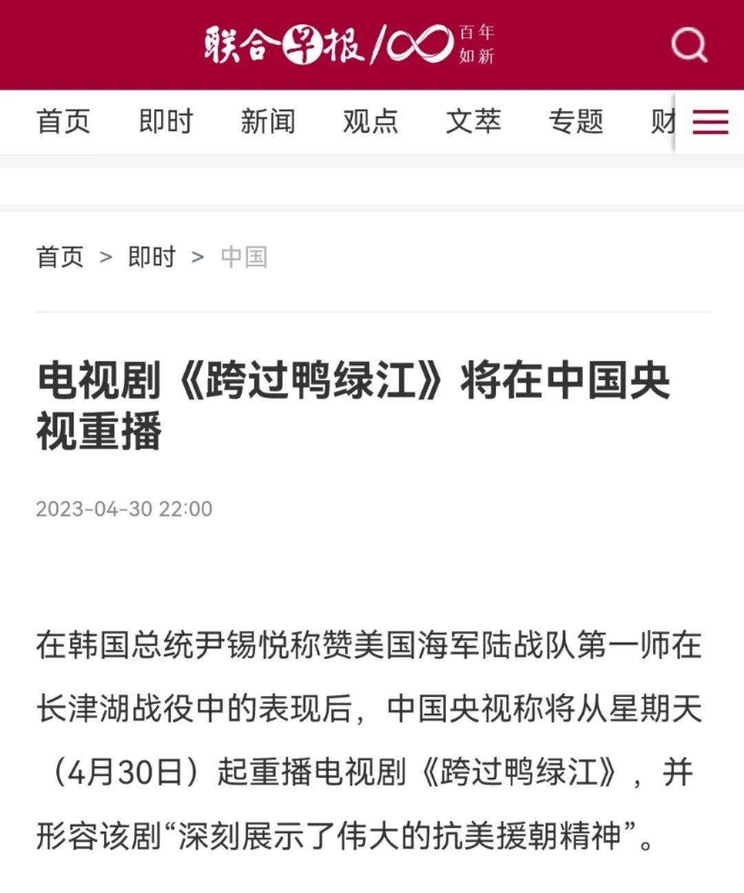 新加坡《聯(lián)合早報(bào)》更在4月30日晚10點(diǎn)準(zhǔn)時(shí)發(fā)布文章《電視劇<跨過(guò)鴨綠江>將在中國(guó)央視重播》,開(kāi)篇明確重點(diǎn):在韓國(guó)總統(tǒng)稱(chēng)贊美國(guó)海軍陸戰(zhàn)隊(duì)第一師在長(zhǎng)津湖戰(zhàn)役中的表現(xiàn)后,中國(guó)央視稱(chēng)將從星期天(4月30日)起重播電視劇《跨過(guò)鴨綠江》。