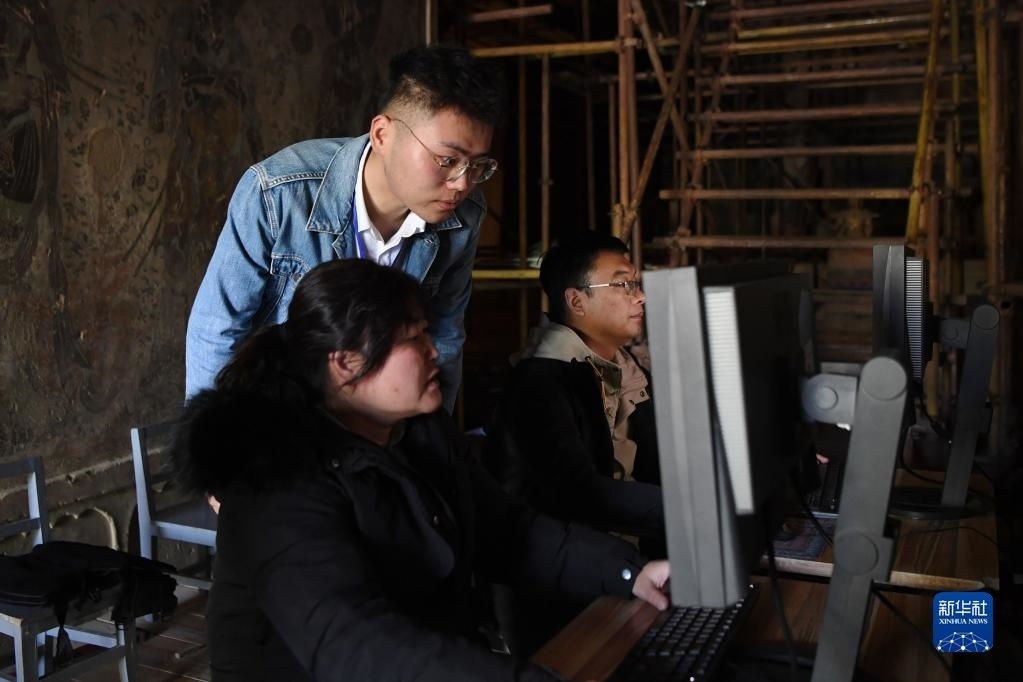 敦煌研究院文物數(shù)字化保護(hù)團(tuán)隊圖像采集人員熊業(yè)騰(中)和同事在洞窟內(nèi)查看剛剛采集到的圖片(4月25日攝)。