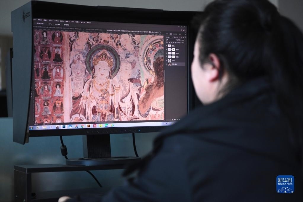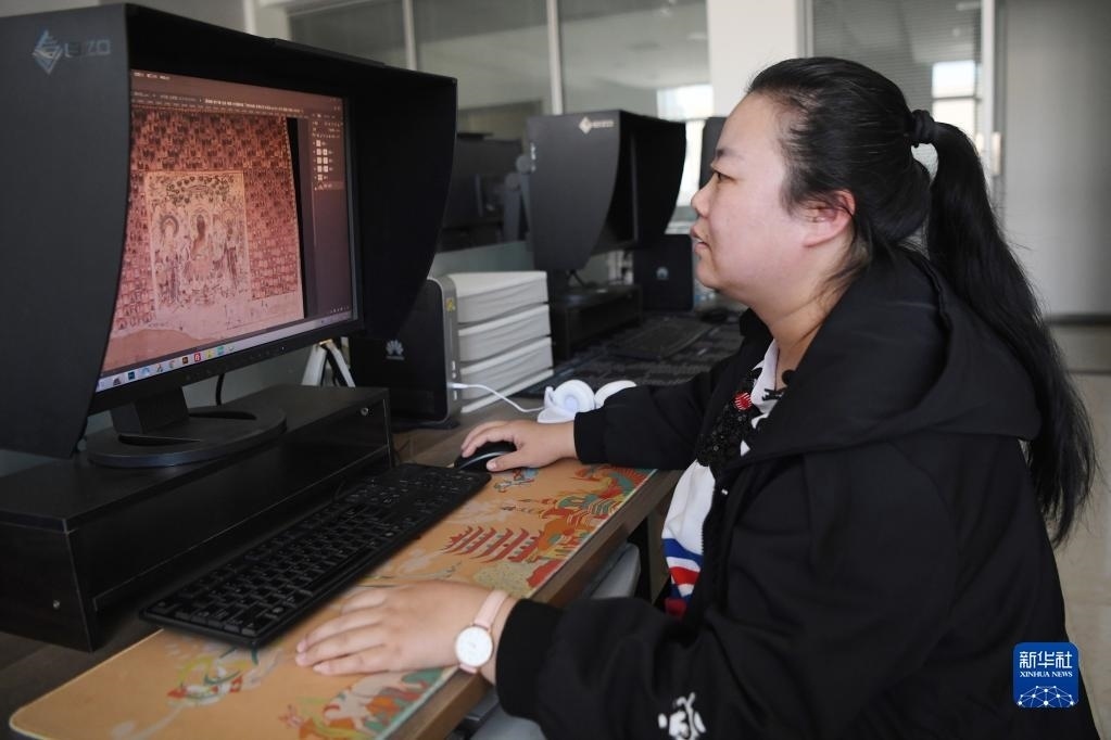 敦煌研究院文物數(shù)字化保護(hù)團(tuán)隊圖像處理人員年海麗在拼接壁畫圖像(4月25日攝)。