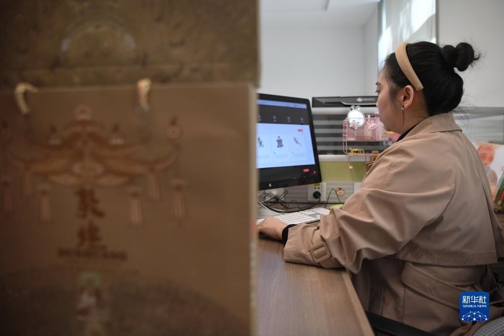 敦煌研究院文物數(shù)字化保護(hù)團(tuán)隊創(chuàng)意營銷人員廖雪婷在整理文創(chuàng)產(chǎn)品(4月25日攝)。