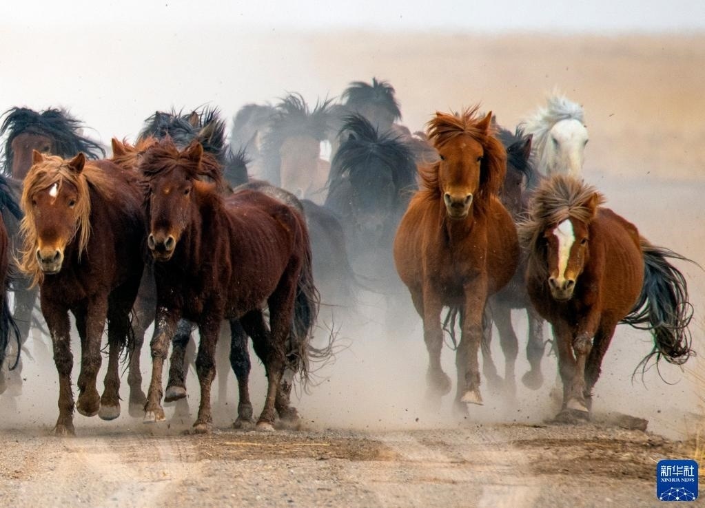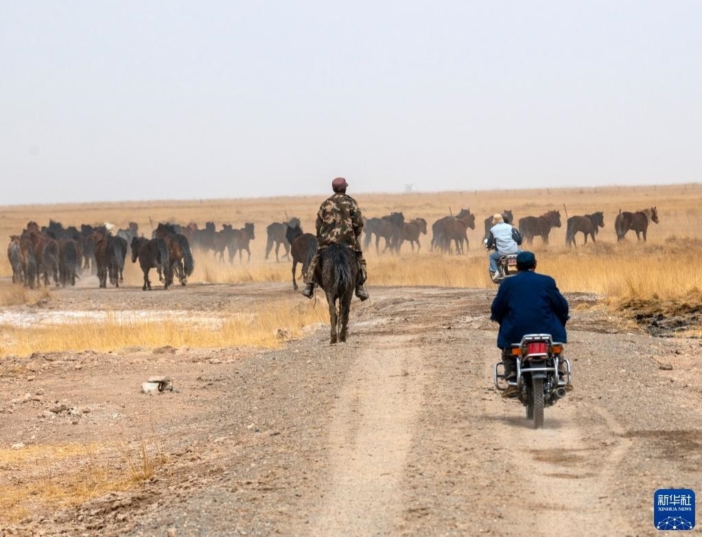 5月3日,在阿克塞縣阿伊納鄉(xiāng)海子草原,馬群轉(zhuǎn)場(chǎng)去往夏季牧場(chǎng)。