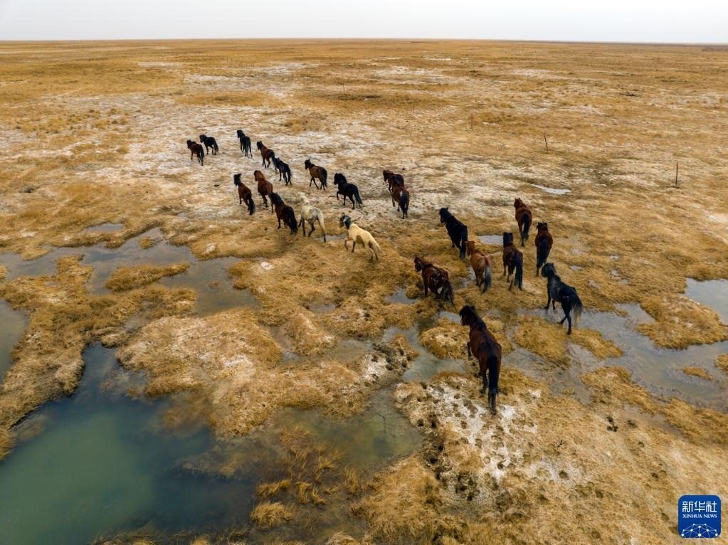 5月3日,在阿克塞縣阿伊納鄉(xiāng)海子草原,馬群轉(zhuǎn)場(chǎng)去往夏季牧場(chǎng)(無(wú)人機(jī)照片)。