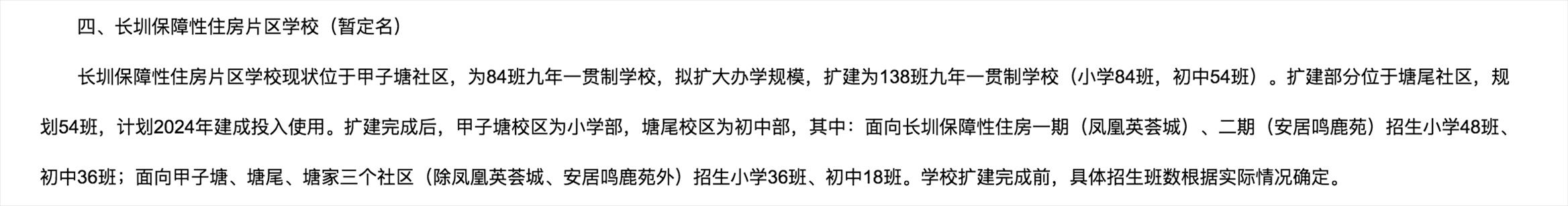 根據(jù)最新的學(xué)區(qū)劃分方案,長圳保障性住房片區(qū)學(xué)校現(xiàn)狀位于甲子塘社區(qū),為84班九年一貫制學(xué)校,擬擴(kuò)大辦學(xué)規(guī)模,擴(kuò)建為138班九年一貫制學(xué)校(小學(xué)84班,初中54班)。擴(kuò)建部分位于塘尾社區(qū),規(guī)劃54班,計劃2024年建成投入使用。擴(kuò)建完成后,甲子塘校區(qū)為小學(xué)部,塘尾校區(qū)為初中部,其中:面向長圳保障性住房一期(鳳凰英薈城)、二期(安居鳴鹿苑)招生小學(xué)48班、初中36班;面向甲子塘、塘尾、塘家三個社區(qū)(除鳳凰英薈城、安居鳴鹿苑外)招生小學(xué)36班、初中18班。