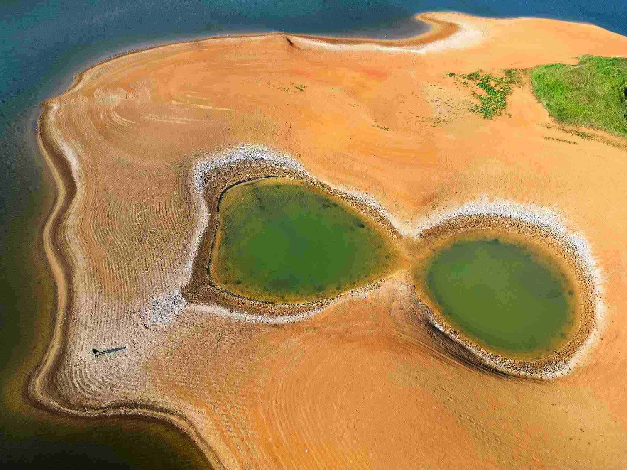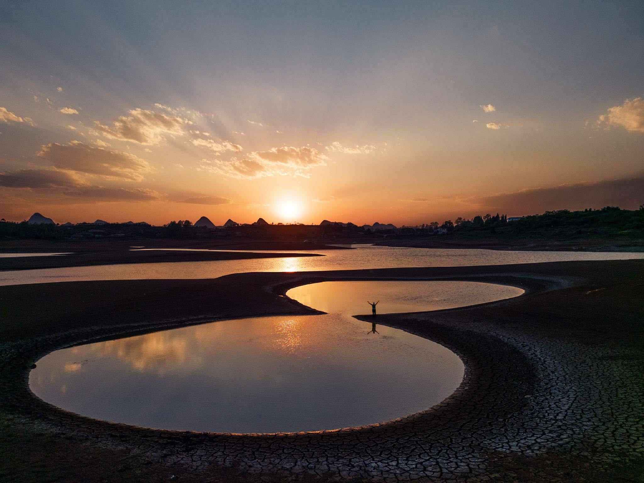 2023年5月2日,貴陽(yáng),紅楓湖水位線(xiàn)下降,湖底大面積裸露,猶如水上丹霞。