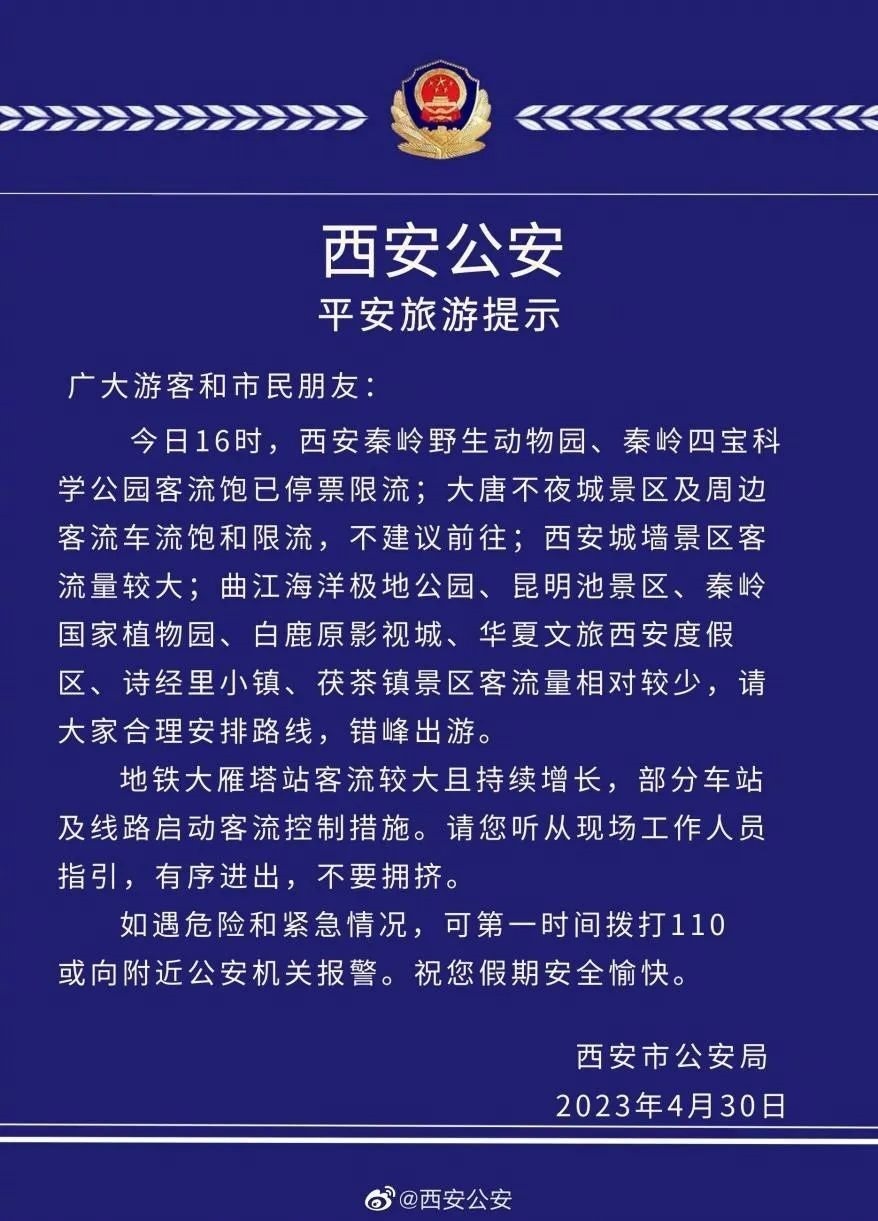 4月30日,西安多個(gè)景區(qū)停票限流。西安公安果斷發(fā)布旅游提示,不建議游客前往大唐不夜城,提示游客合理安排路線,錯(cuò)峰出游。