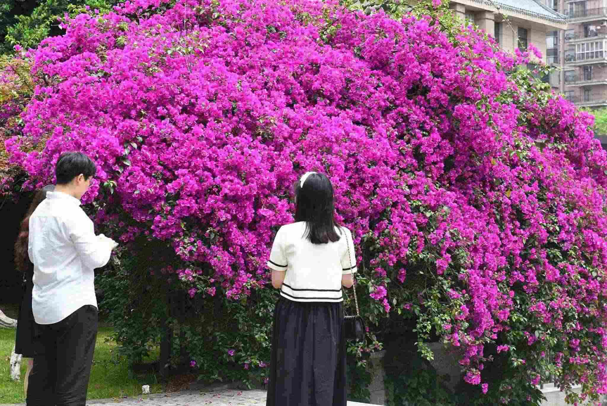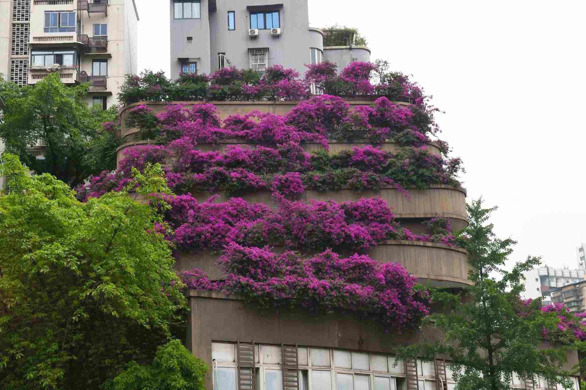 2023年5月5日,重慶,渝中區(qū)上清寺一建筑被盛開(kāi)的三角梅層層環(huán)繞,仿佛穿上了一件“花衣”。視覺(jué)中國(guó)