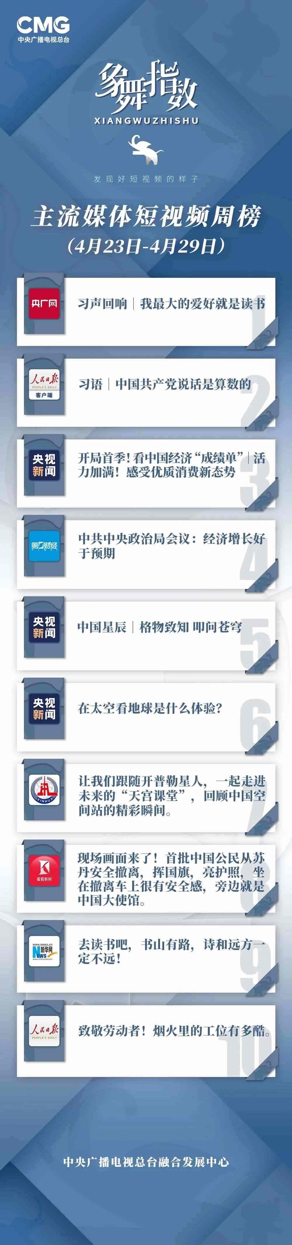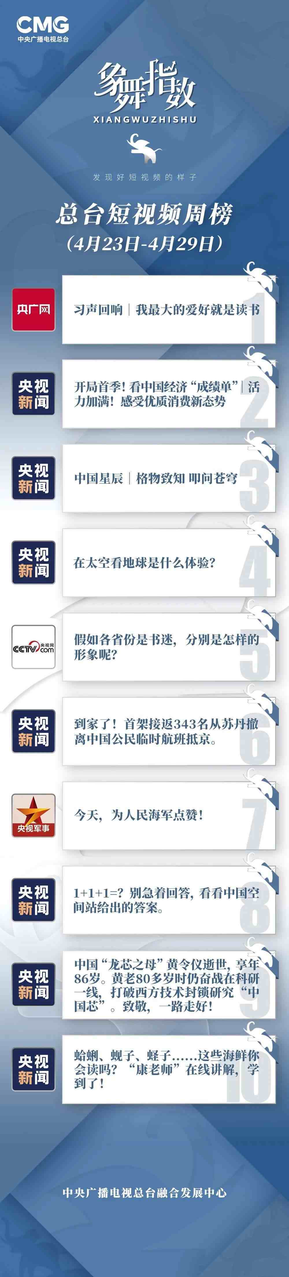 中央廣播電視總臺“象舞指數(shù)”評議品牌,推出主流媒體短視頻周榜、總臺短視頻周榜。在2023年4月23日—4月29日,這些內(nèi)容引發(fā)大眾關(guān)注: