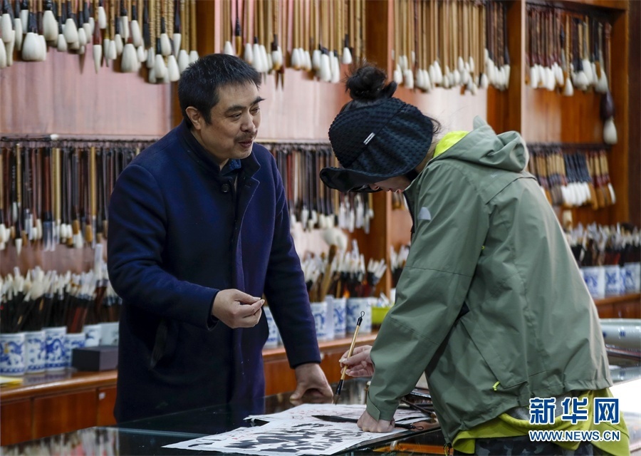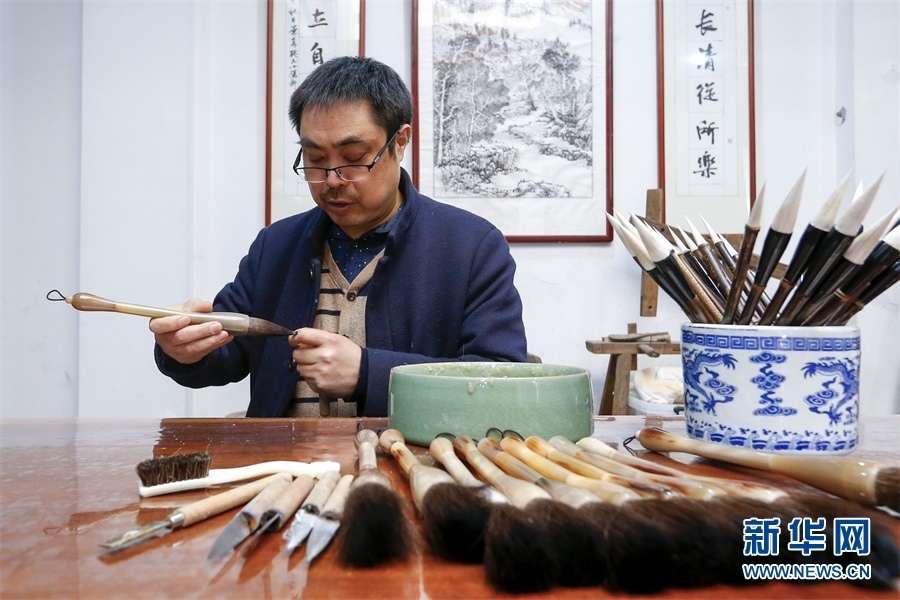 一支好的徽筆,不僅要保留傳統(tǒng)工藝,且要在原基礎(chǔ)上不斷創(chuàng)新、改良。楊文尤其重視書畫家對筆的使用反饋:“因為他們對用筆最挑剔,而且現(xiàn)代書畫家創(chuàng)作方式和作品不斷創(chuàng)新,對毛筆也有新的要求,他們提出的要求我總是盡力去滿足,也使得制筆技藝進(jìn)一步得到了提高?!? 新華網(wǎng)發(fā)(施亞磊 攝)