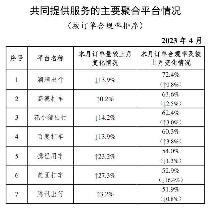 其中,面向乘客、與網(wǎng)約車平臺公司共同提供服務(wù)的平臺(俗稱“聚合平臺”)完成1.96億單,環(huán)比下降0.7%。按訂單合規(guī)率由高到低的分別是滴滴出行、高德打車、花小豬出行、百度打車、攜程用車、美團(tuán)打車、騰訊出行。