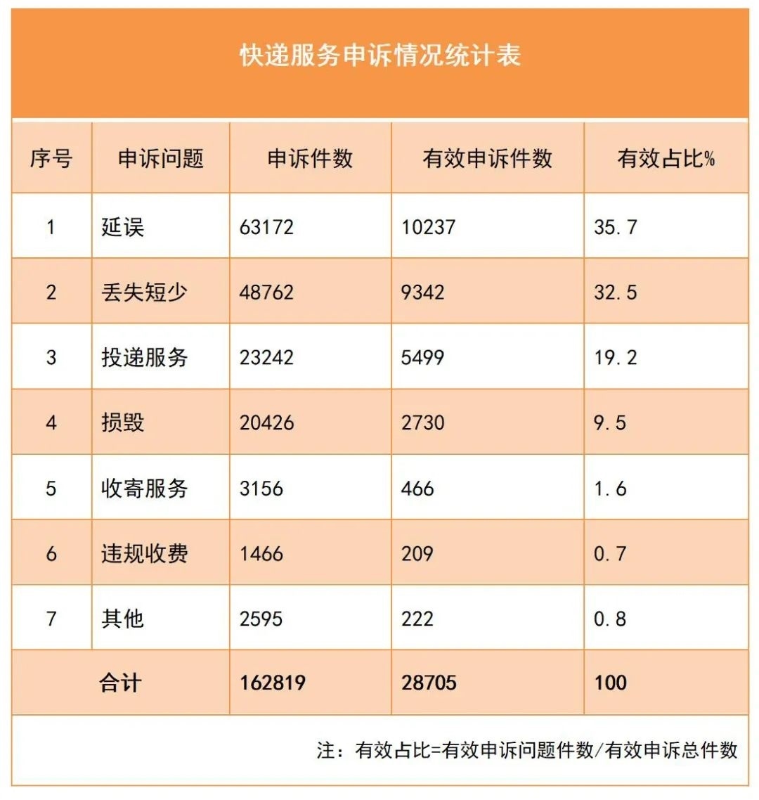 1.快遞服務(wù)申訴問(wèn)題數(shù)量與類別情況。用戶對(duì)快遞服務(wù)問(wèn)題申訴162819件,其中有效申訴28705件,涉及的主要問(wèn)題依次是快件延誤、快件丟失短少和投遞服務(wù),分別占有效申訴總量的35.7%、32.5%和19.2%。