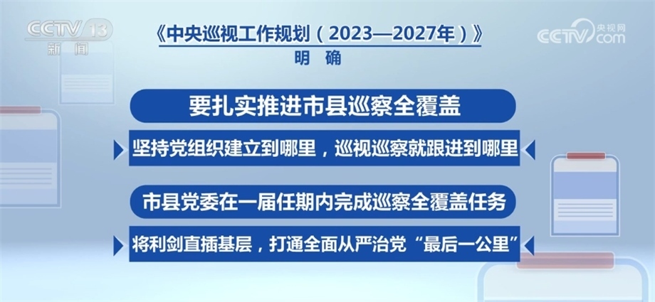 央視網(wǎng)消息:近日,經(jīng)黨中央同意,中共中央辦公廳印發(fā)了《中央巡視工作規(guī)劃(2023—2027年)》,對今后5年的巡視工作作出了部署。一屆任期內(nèi)實現(xiàn)巡視全覆蓋,是黨章規(guī)定的政治任務(wù)。通過什么樣的方式實現(xiàn)二十屆中央巡視全覆蓋?采取哪些措施高質(zhì)量推進(jìn)巡視全覆蓋?在此次印發(fā)的巡視工作規(guī)劃中都作出了要求。