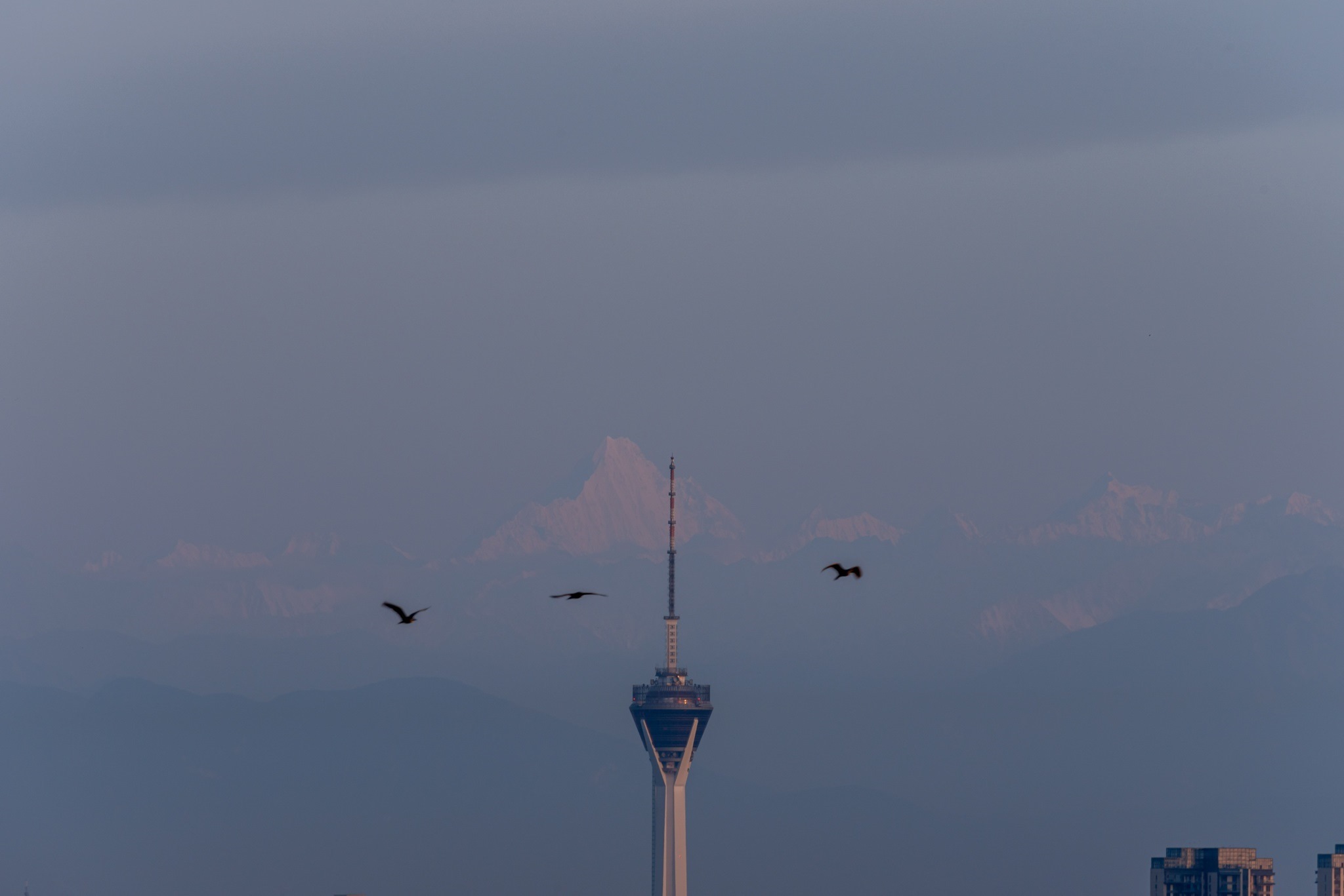 2023年5月13日,成都,幺妹峰露出真容,與城市建筑同框。視覺(jué)中國(guó)
