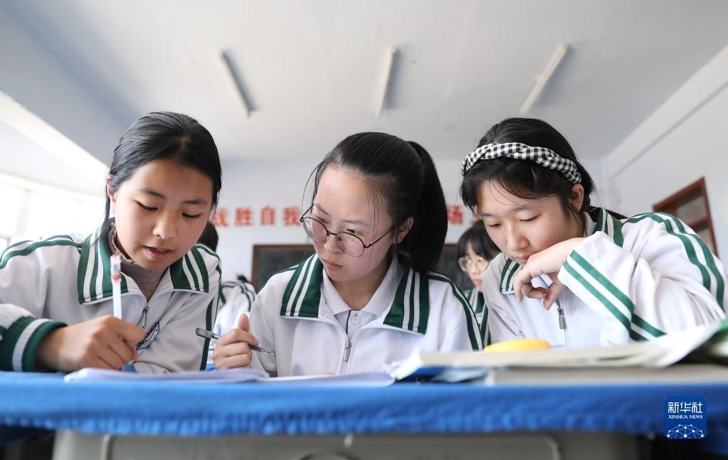 女兒李昕偉(中)課間和同學(xué)們交流習題,由于聽不太清,她需要目不轉(zhuǎn)睛地盯著同學(xué)的筆(5月8日攝)。