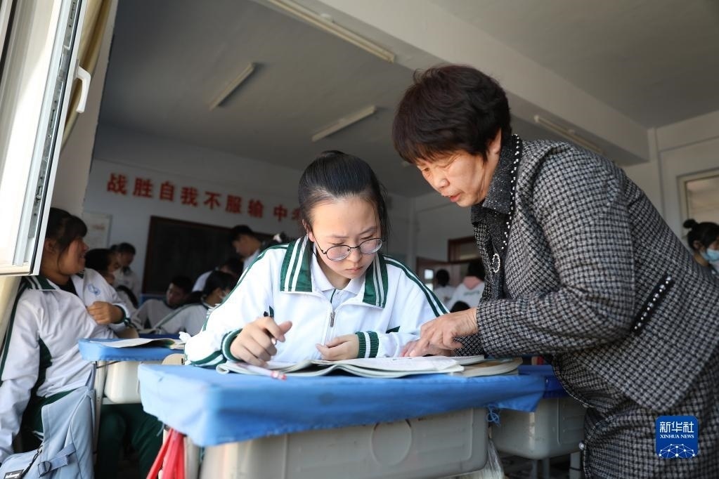 英語老師在課間輔導(dǎo)李昕偉(5月8日攝)。