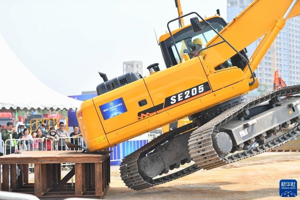 在湖南長沙舉辦的第三屆長沙國際工程機械展覽會上,機手們駕駛挖掘機和裝載機進(jìn)行整機漂移、“空中漫步”等,并擺出各種造型、秀“舞技”。