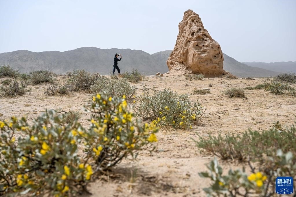 5月13日,駝峰(長城)文物保護(hù)隊(duì)員布音烏力吉在阿拉善左旗一處烽火臺遺址巡查并拍照記錄。   新華社記者 貝赫 攝