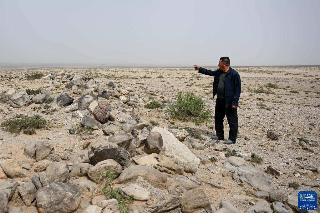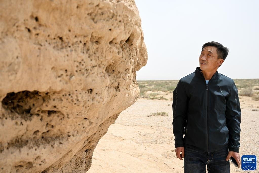 5月13日,駝峰(長城)文物保護(hù)隊(duì)員布音烏力吉在觀察阿拉善左旗一處烽火臺遺址表面,查看是否有人為破壞痕跡。   新華社記者 貝赫 攝