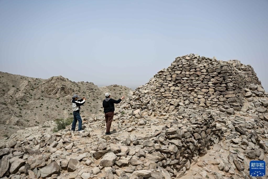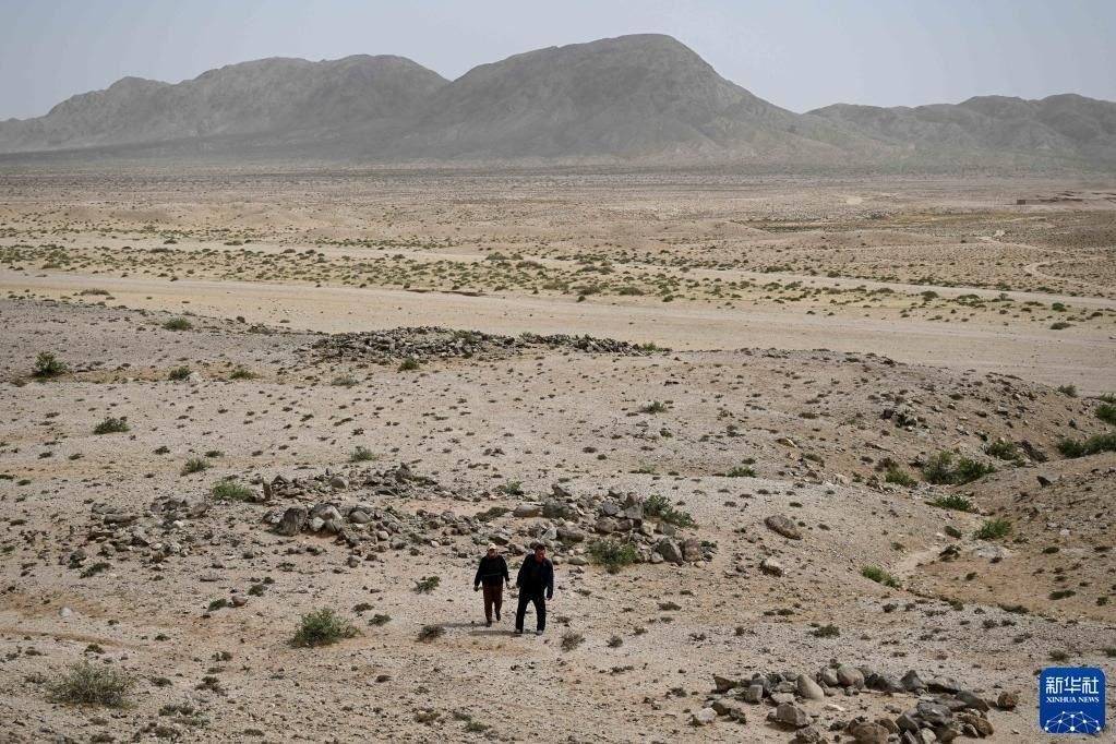 5月13日,駝峰(長城)文物保護(hù)隊(duì)員許繼龍(右)和烏仁其其格在巡查阿拉善左旗一處石圈遺址。   新華社記者 貝赫 攝