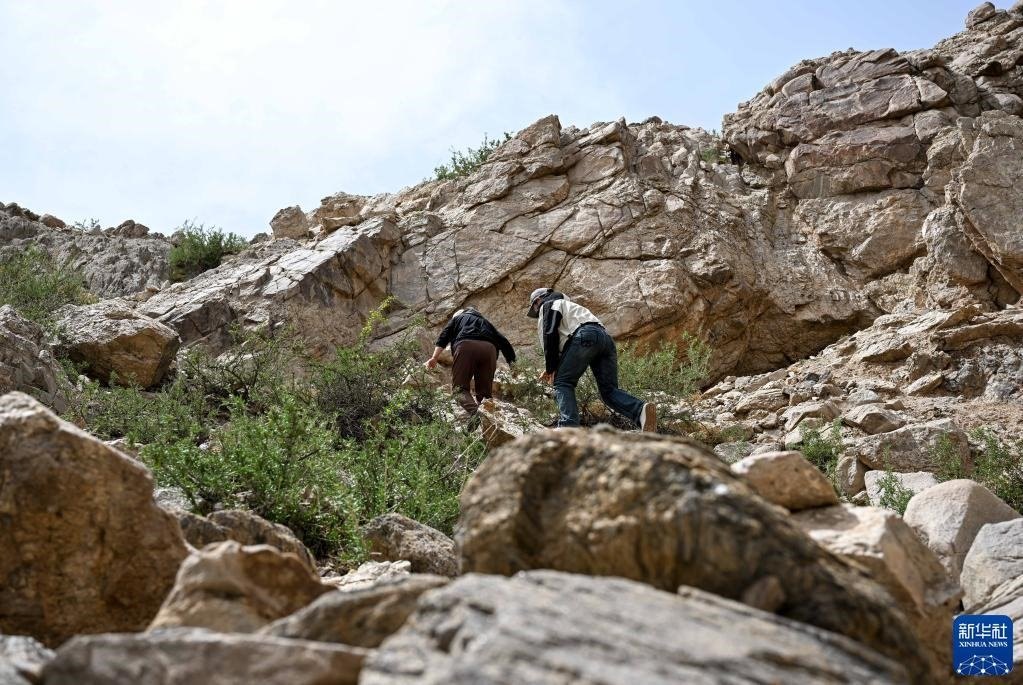 5月13日,駝峰(長城)文物保護(hù)隊(duì)員許繼龍?jiān)谘膊榘⒗谱笃煲惶幨z址。   新華社記者 貝赫 攝