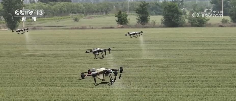 在山西運城,439萬畝小麥從北到南陸續(xù)進入揚花灌漿關鍵期,農(nóng)技人員在田間地頭給予農(nóng)戶技術指導。在運城河津市村民馬關發(fā)的小麥田里,10架無人機正在麥田上方進行噴灑作業(yè)。