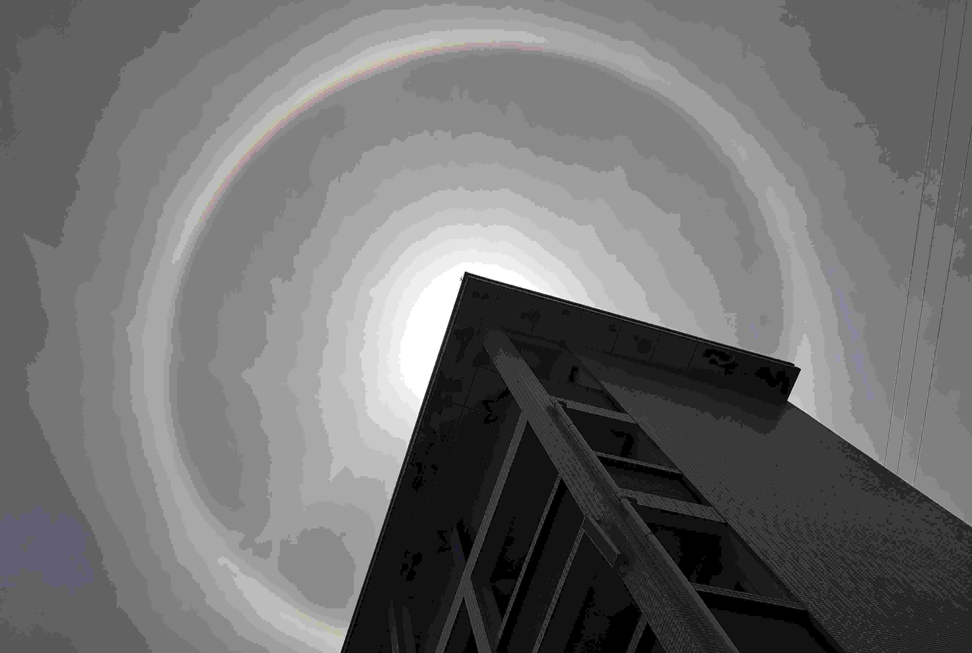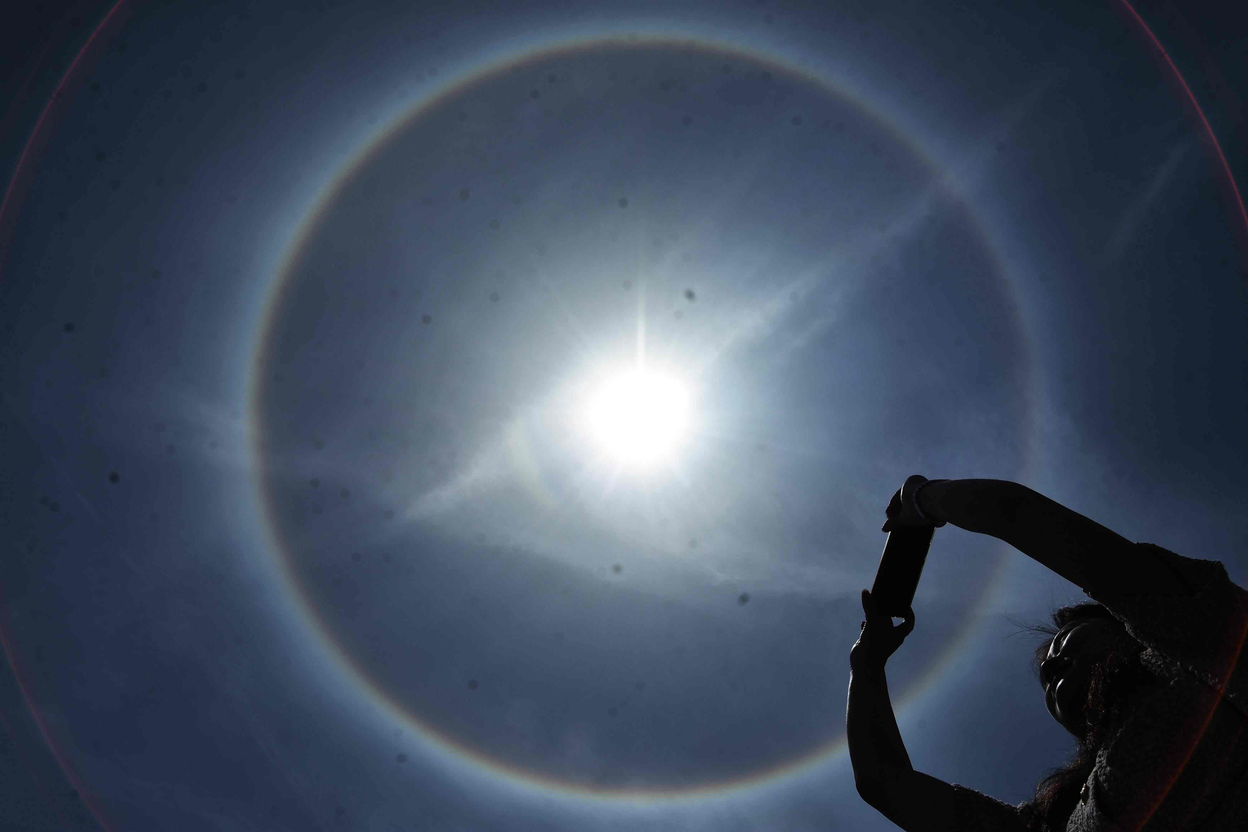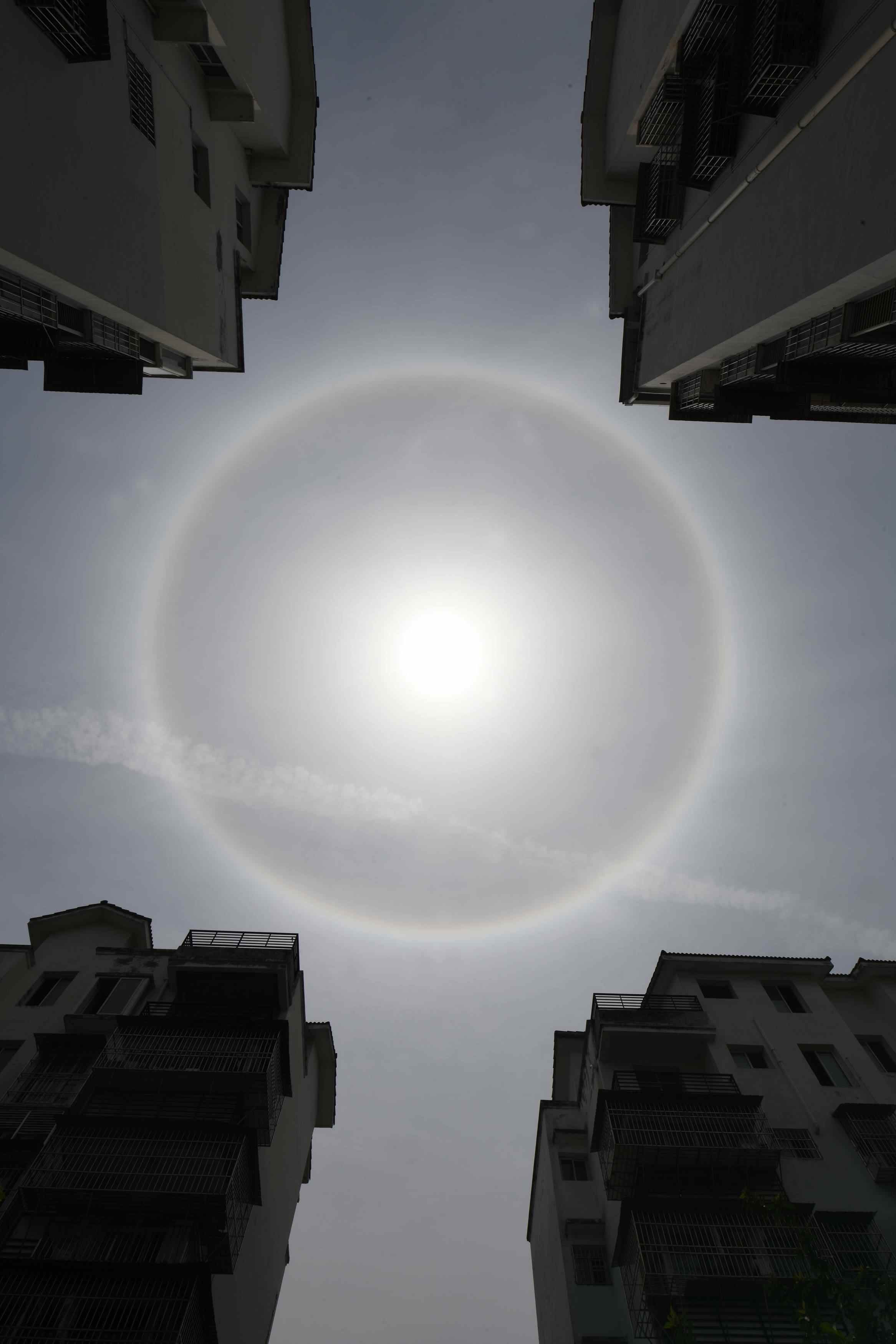 2023年5月15日中午,湖北宜昌,天空出現(xiàn)日暈景觀。當(dāng)日,多地天空出現(xiàn)日暈。日暈是一種大氣光學(xué)現(xiàn)象,是太陽光通過云層中的冰晶折射或反射而形成的。 視覺中國