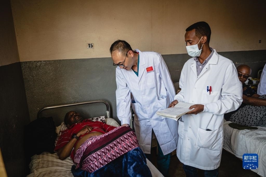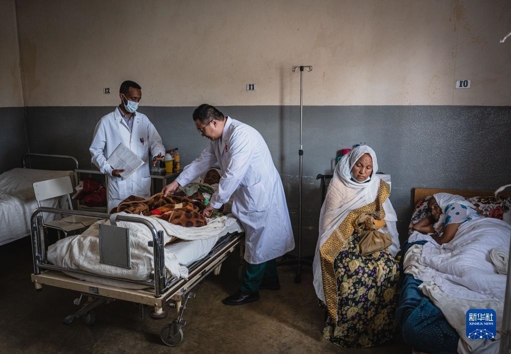 5月9日,在厄立特里亞首都阿斯馬拉的哈利貝特醫(yī)院,醫(yī)療隊(duì)脊柱外科醫(yī)生周大凱(左)為患者做檢查。