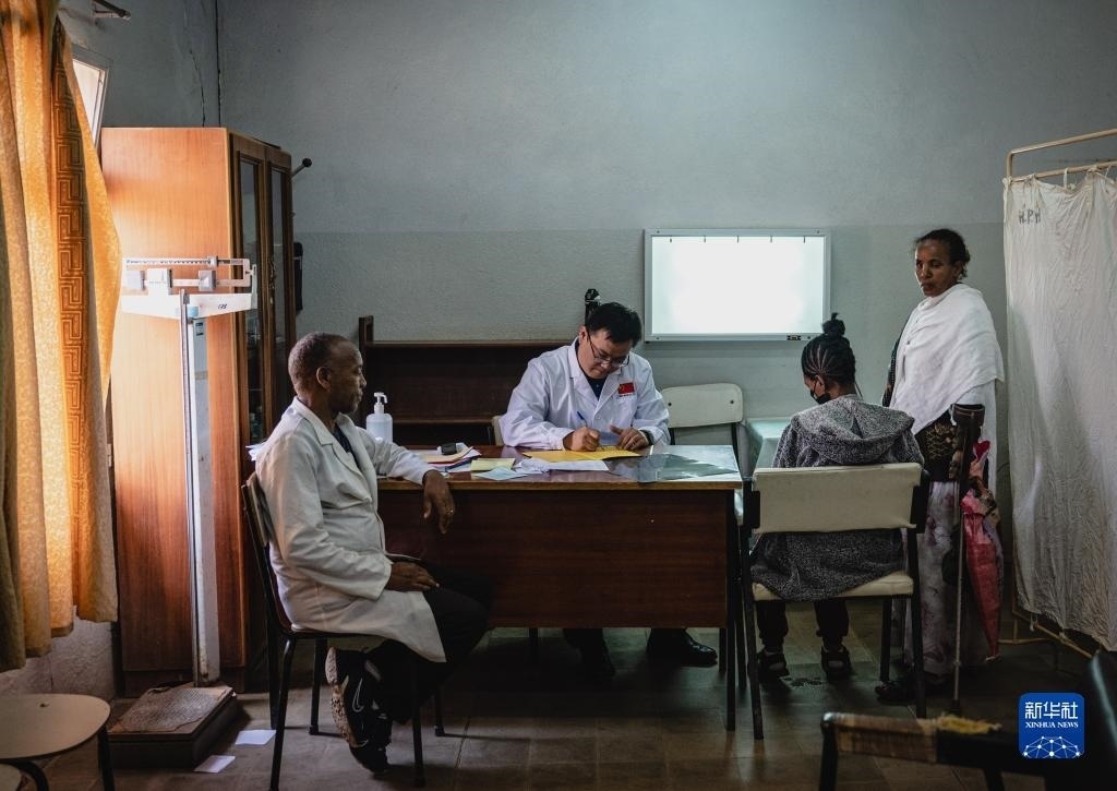 5月9日,在厄立特里亞首都阿斯馬拉的哈利貝特醫(yī)院,醫(yī)療隊(duì)脊柱外科醫(yī)生周大凱(中)為患者做檢查。