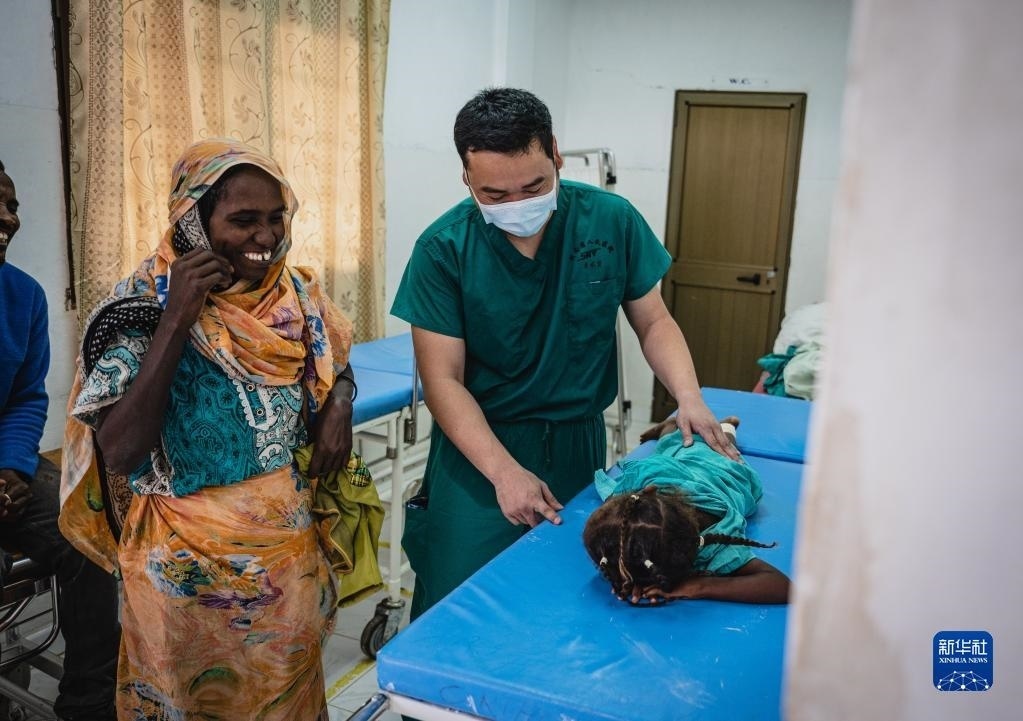 5月9日,在厄立特里亞首都阿斯馬拉的哈利貝特醫(yī)院,醫(yī)療隊(duì)隊(duì)長(zhǎng)、脊柱外科醫(yī)生朱振軍(前)為患者做檢查。