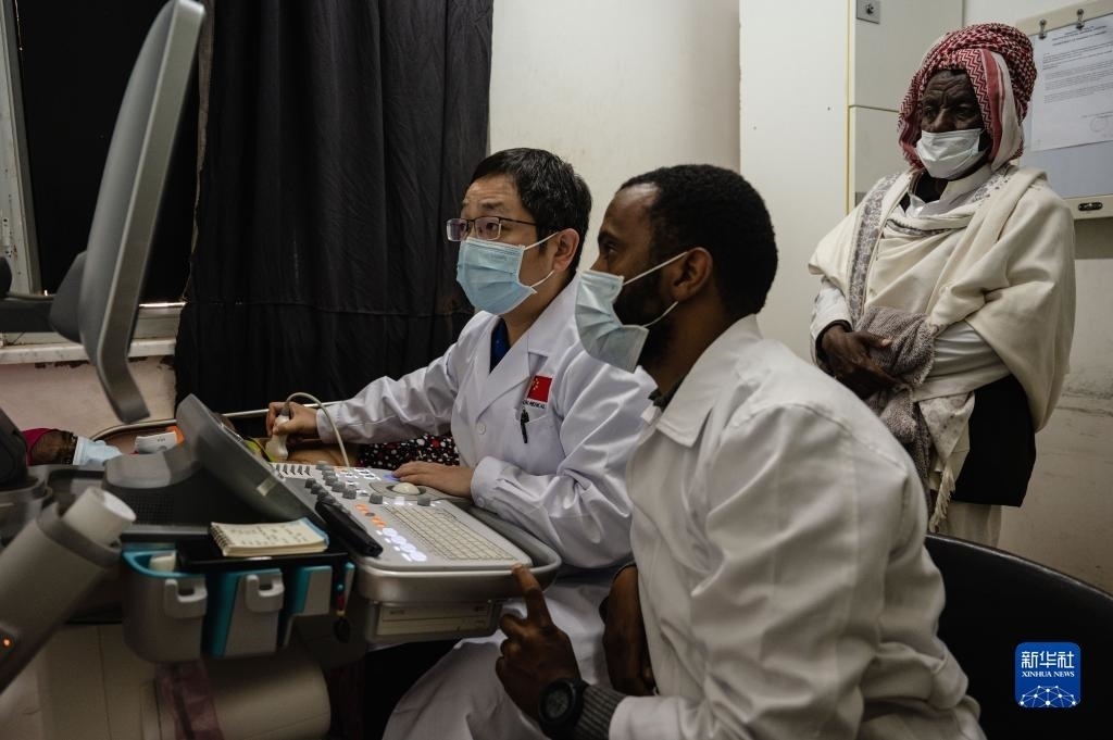 5月9日,在厄立特里亞首都阿斯馬拉的奧羅特醫(yī)院,醫(yī)療隊(duì)超聲科醫(yī)生王曉(左)為患者做檢查。