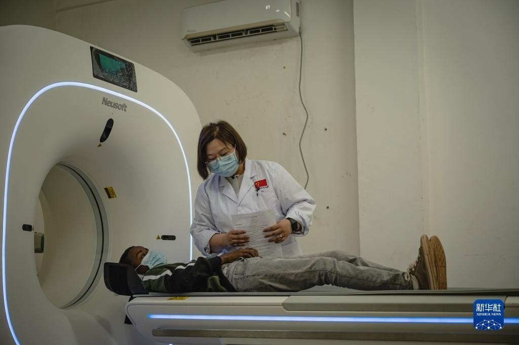 5月9日,在厄立特里亞首都阿斯馬拉的奧羅特醫(yī)院,醫(yī)療隊(duì)CT室醫(yī)生田茜為患者做檢查。