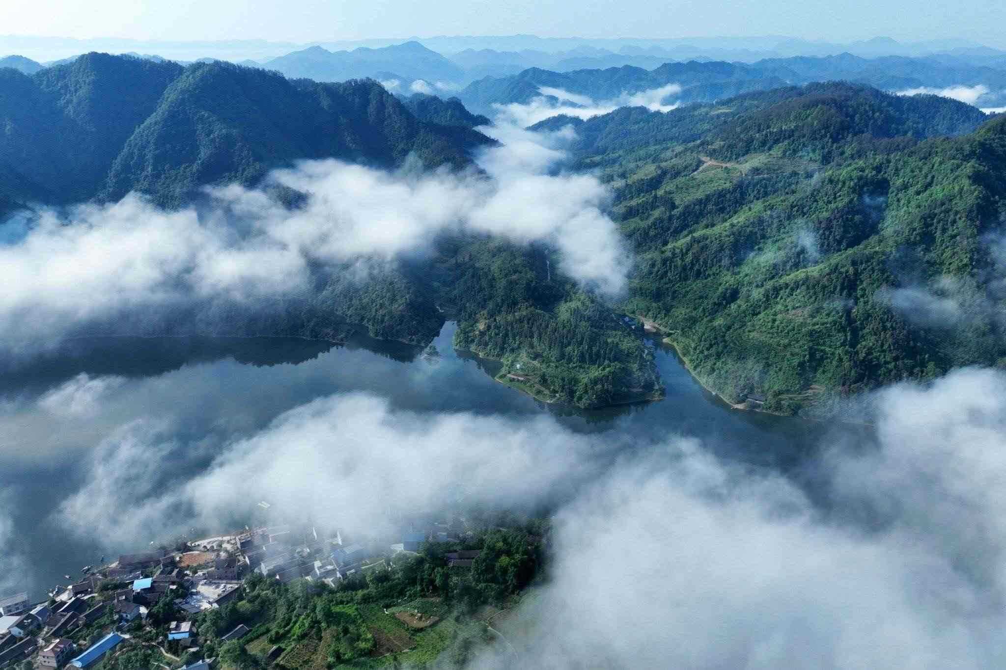 2023年5月18日,重慶,酉陽縣酉水河鎮(zhèn)河灣山寨,晨霧下的酉水河風(fēng)光。視覺中國
