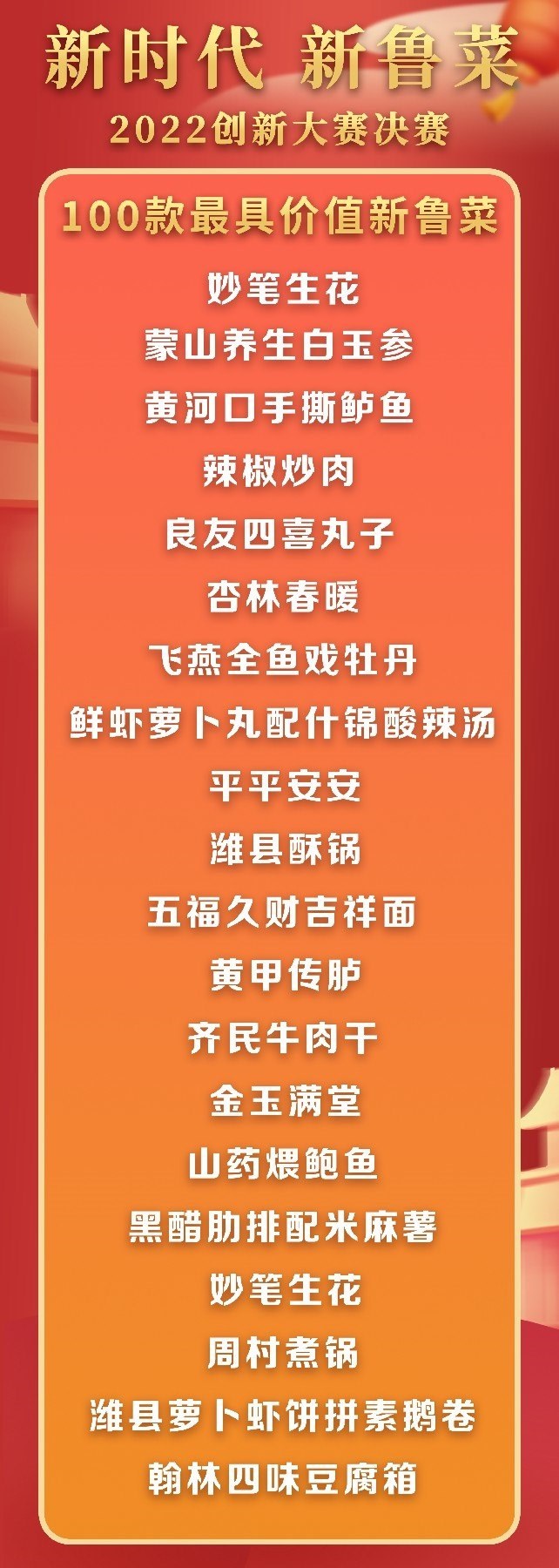 5月18日至19日,“新時代 新魯菜”2022創(chuàng)新大賽決賽暨頒獎活動在山東省濰坊市峽山區(qū)成功舉行,標(biāo)志著本屆大賽圓滿結(jié)束。經(jīng)過激烈角逐,大賽最終頒發(fā)出2022年度“十大魯菜創(chuàng)新菜品”、“20款我最喜愛的新魯菜”、“100款最具價值新魯菜”、“十大創(chuàng)新面點”、“預(yù)制菜轉(zhuǎn)化創(chuàng)新獎”和“海外最佳傳播獎”等獎項。此外,大賽組委會還頒發(fā)了“最佳組織獎”、“融媒貢獻(xiàn)獎”和“特殊貢獻(xiàn)獎”等獎項。