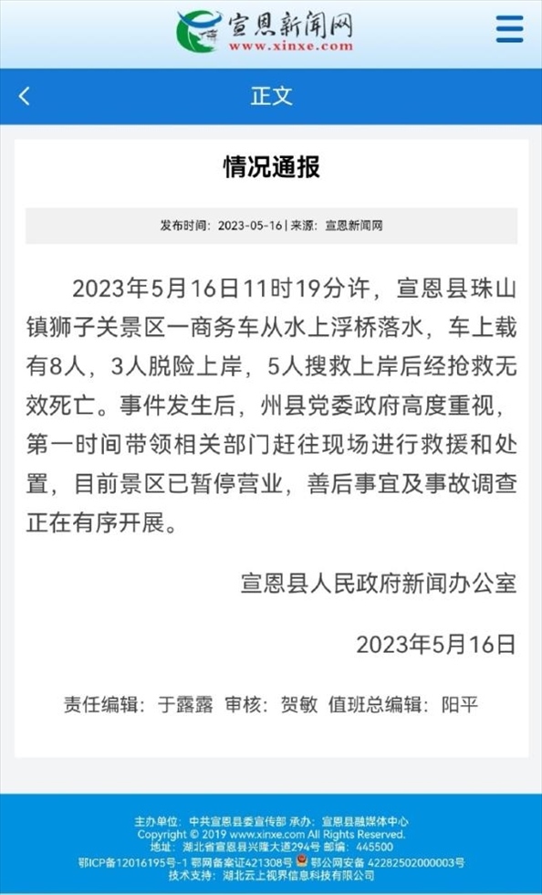 ·官方通報(bào)“恩施網(wǎng)紅浮橋墜車事故”:5人死亡,景區(qū)已暫停營(yíng)業(yè)。