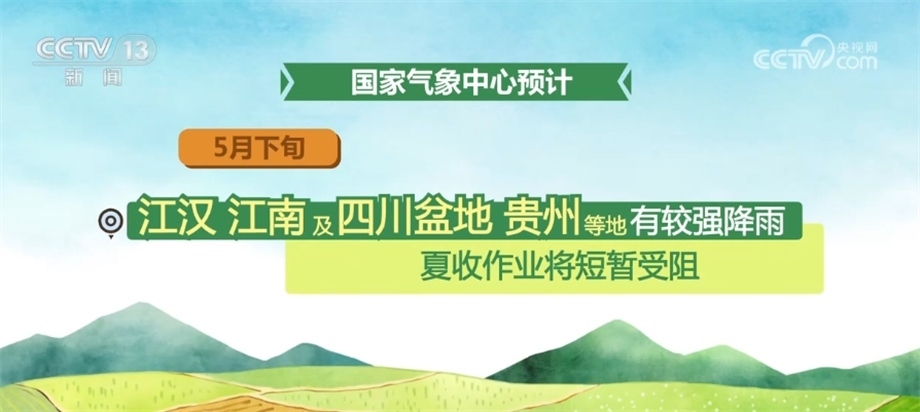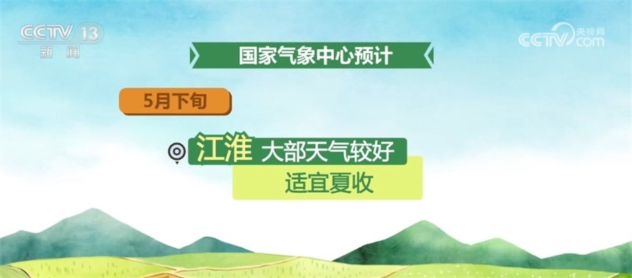 國家氣象中心預(yù)計,5月下旬,北方冬麥區(qū)大部分時段以晴好天氣為主,墑情適宜,利于冬小麥灌漿成熟;江漢、江南及四川盆地、貴州等地有較強降雨,夏收作業(yè)將短暫受阻;江淮大部天氣較好,適宜夏收。