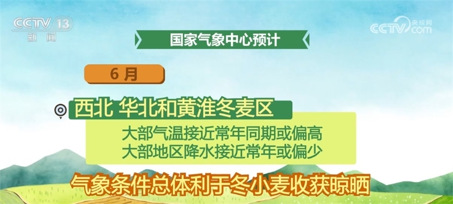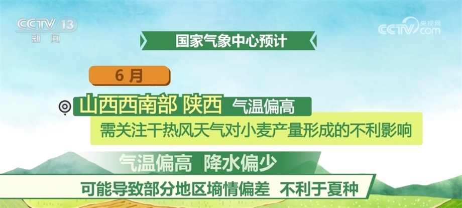 6月,西北、華北和黃淮冬麥區(qū)大部氣溫接近常年同期或偏高,大部地區(qū)降水接近常年或偏少,氣象條件總體利于冬小麥收獲晾曬;但山西西南部、陜西氣溫偏高,需關(guān)注干熱風天氣對小麥產(chǎn)量形成的不利影響,此外,氣溫偏高、降水偏少可能導(dǎo)致部分地區(qū)墑情偏差,不利于夏種。
