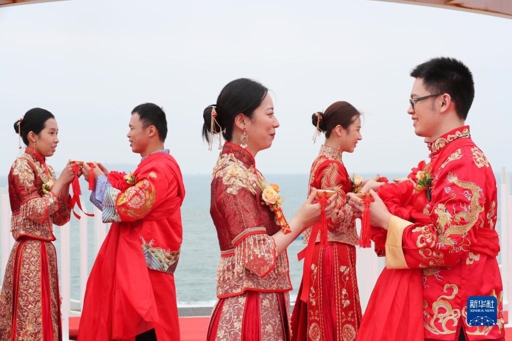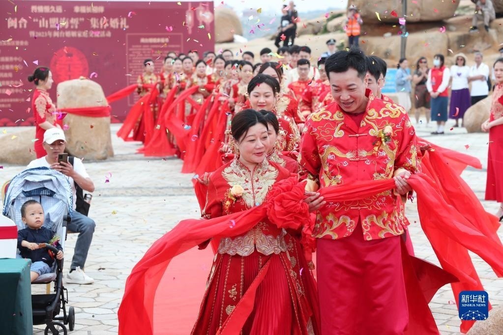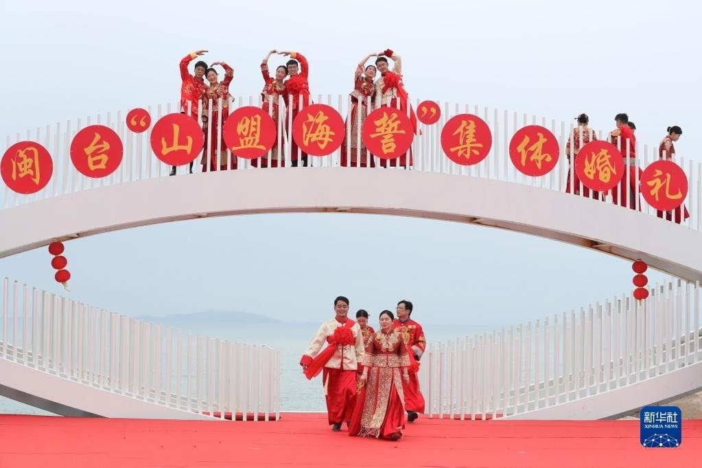 當(dāng)日,一場以“愛情恒久遠(yuǎn)、幸福長相伴”為主題的閩臺(tái)“山盟海誓”集體婚禮暨2023年閩臺(tái)婚姻家庭交流活動(dòng)在福建省福州市平潭縣舉辦。21對閩臺(tái)新人身穿紅色中式婚服,手牽紅繡球,行跨火盆、踩瓦片、扎繡球和“合茶”、“合巹”、“海誓”等閩臺(tái)傳統(tǒng)結(jié)婚禮儀,結(jié)下跨越海峽的姻緣。