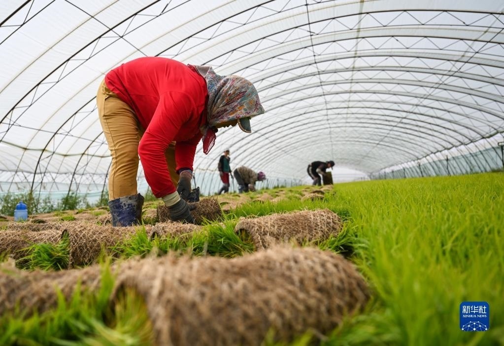 5月23日,達(dá)拉特旗昭君鎮(zhèn)村民在育秧苗大棚中起秧。