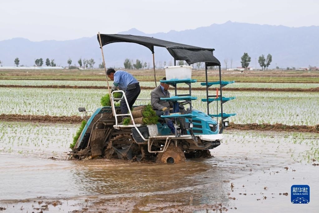 5月23日,達(dá)拉特旗昭君鎮(zhèn)村民在鹽堿地改良水稻田中使用農(nóng)機(jī)插秧。