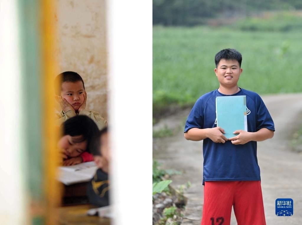 拼版照片:左圖為2012年7月4日,在大化瑤族自治縣板升鄉(xiāng)弄勇小學(xué),7歲的蒙錦晨在課堂上;右圖為2023年1月25日,在大化瑤族自治縣板升鄉(xiāng)弄勇村,正在浙江省臺(tái)州職業(yè)技術(shù)學(xué)院讀大一的蒙錦晨寒假回家時(shí)在村中留影。 新華社記者 黃孝邦 攝