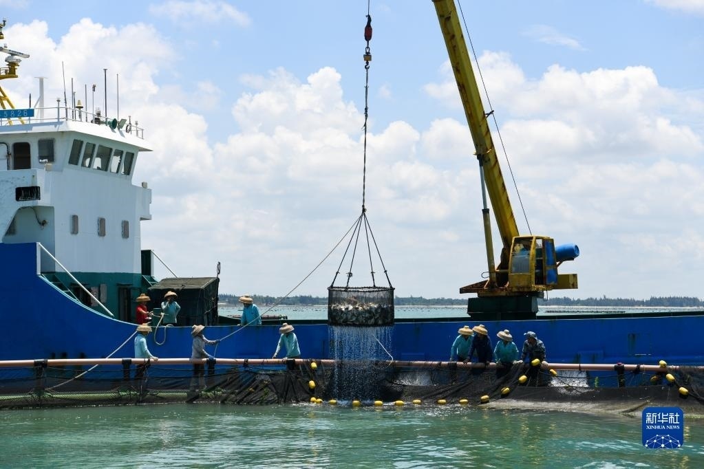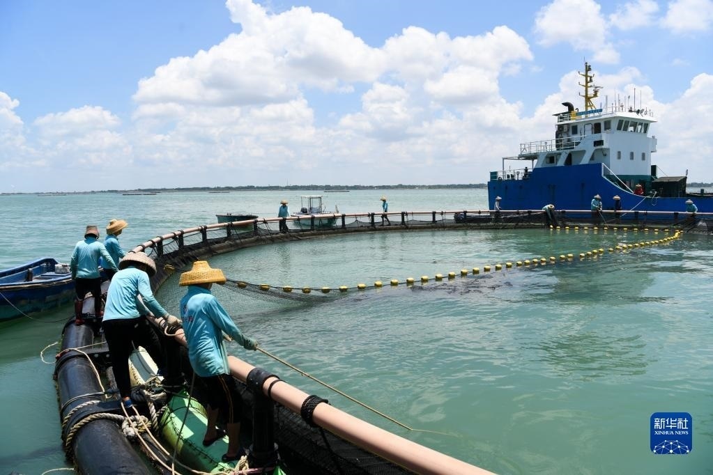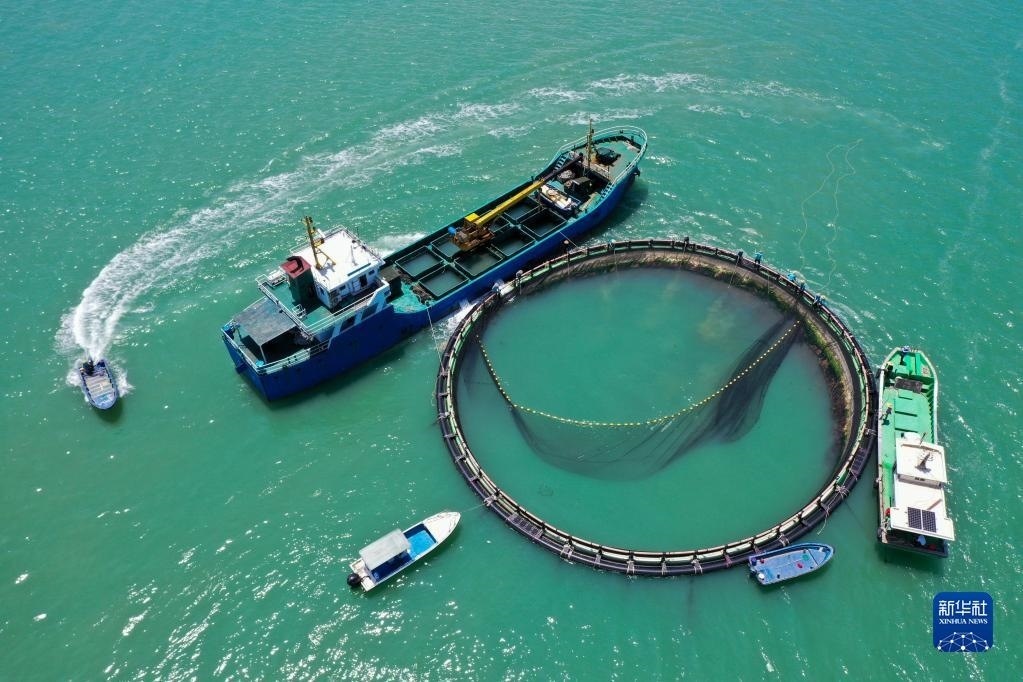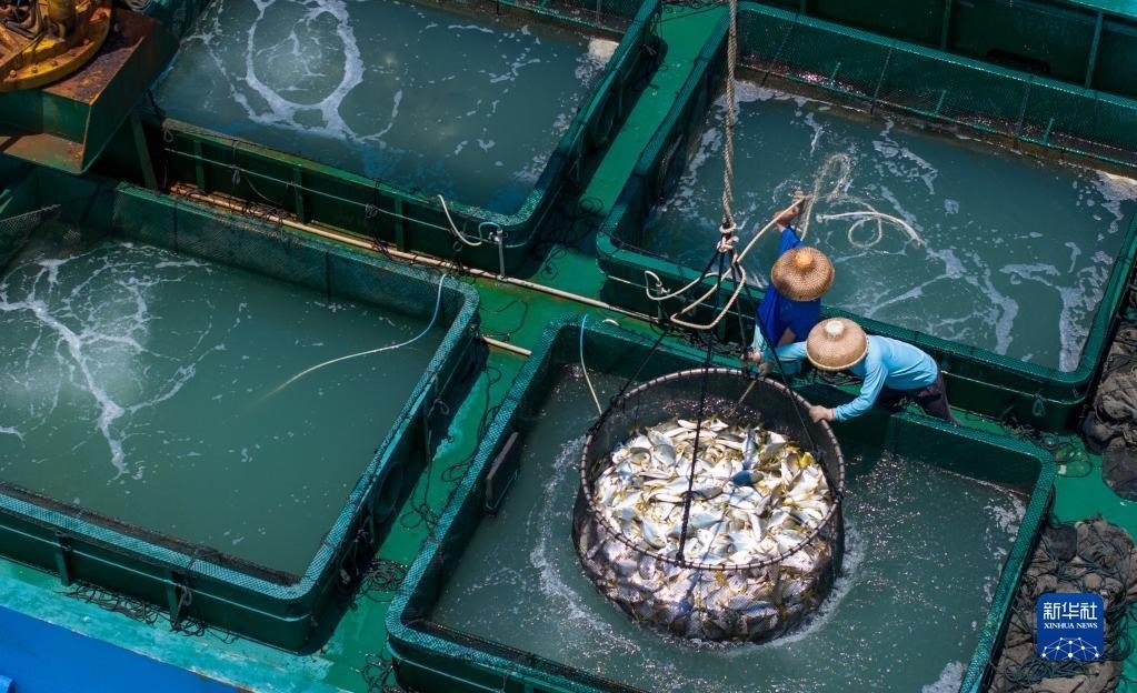 5月27日,在湛江市徐聞縣西連鎮(zhèn),漁業(yè)工人從徐聞國橋深海養(yǎng)殖有限公司的金鯧魚深海網(wǎng)箱捕魚(無人機照片)。