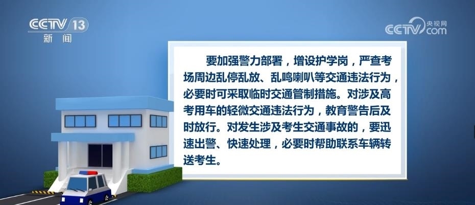 要加強(qiáng)警力部署,增設(shè)護(hù)學(xué)崗,嚴(yán)查考場(chǎng)周邊亂停亂放、亂鳴喇叭等交通違法行為,必要時(shí)可采取臨時(shí)交通管制措施。對(duì)涉及高考用車的輕微交通違法行為,教育警告后及時(shí)放行。對(duì)發(fā)生涉及考生交通事故的,要迅速出警、快速處理,必要時(shí)幫助聯(lián)系車輛轉(zhuǎn)送考生。