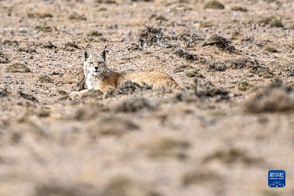 一只猞猁在阿爾金山國家級自然保護區(qū)休息(5月25日攝)。