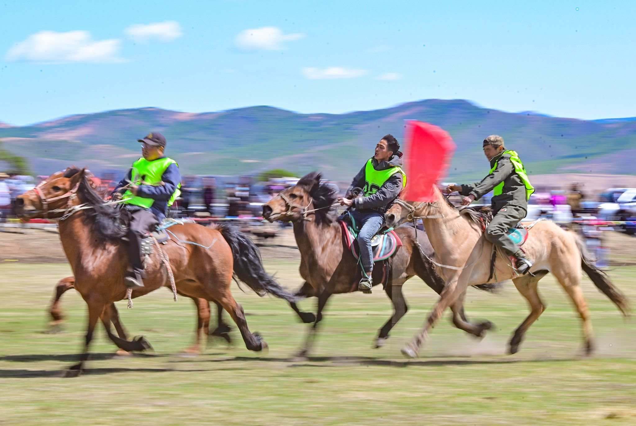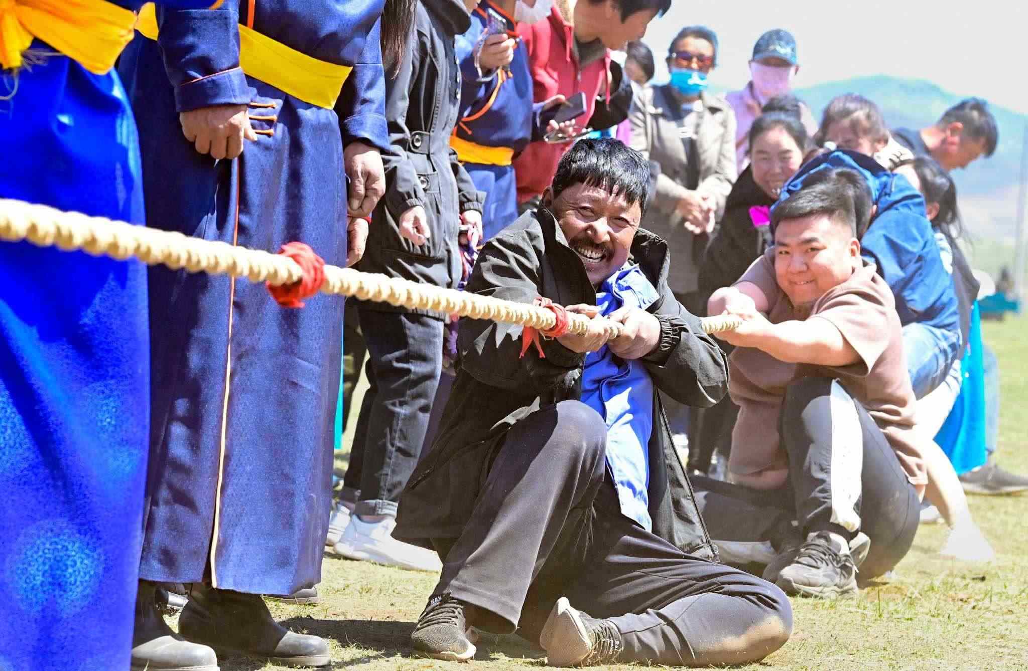 2023年5月26日,內(nèi)蒙古興安盟,科爾沁右翼前旗德伯斯鎮(zhèn)阿日林一合嘎查舉行首屆那達慕,設置的賽馬、布魯、搏克、拔河等傳統(tǒng)體育娛樂項目,吸引嘎查周邊500余名牧民參加比賽,喜慶牧業(yè)豐收季。視覺中國