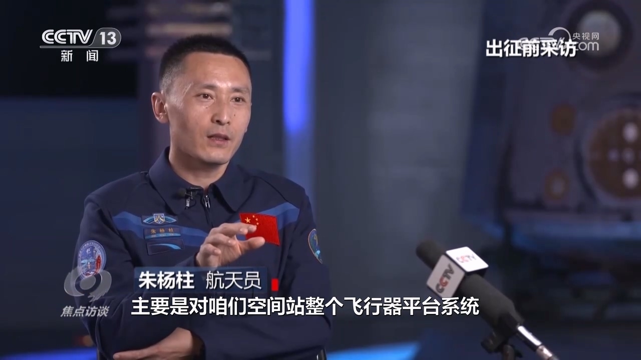航天員朱楊柱:“我作為航天飛行工程師,主要對(duì)空間站整個(gè)飛行器平臺(tái)系統(tǒng)進(jìn)行日常維護(hù)、保養(yǎng),同時(shí)也要照顧好很多試驗(yàn)、實(shí)驗(yàn)和一些艙內(nèi)外的載荷、科學(xué)機(jī)柜?!?/p>