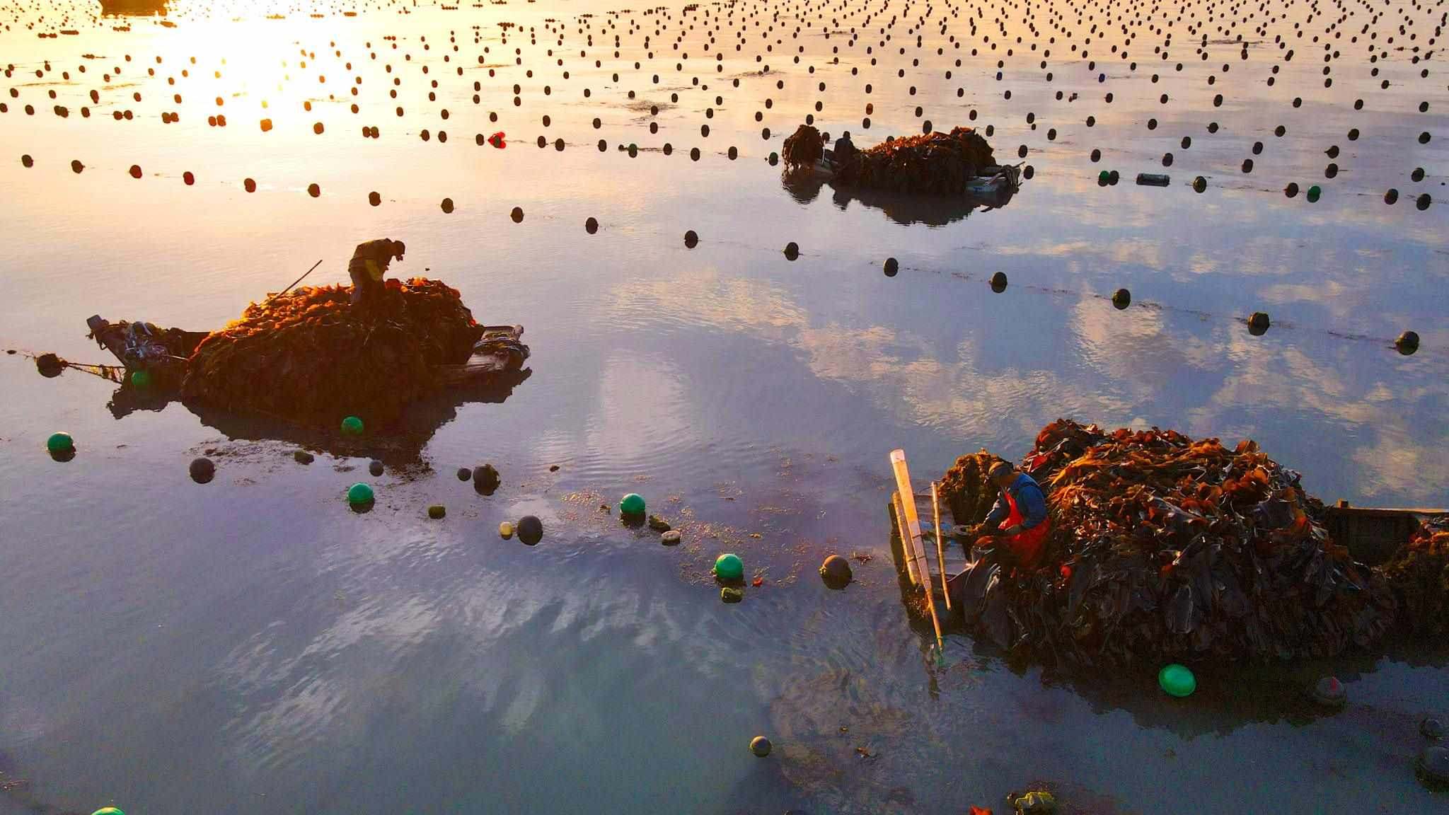 山東威海:漁民駕船收獲海帶
