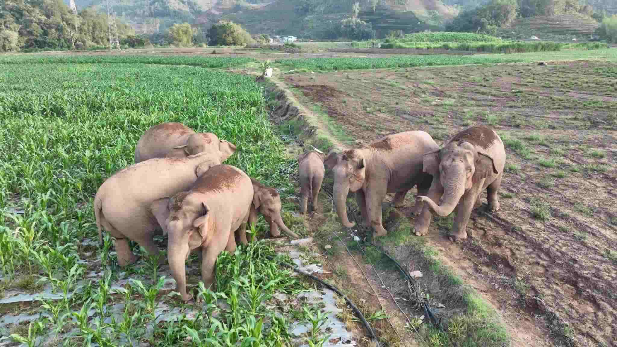 2023年5月17日,云南普洱,亞洲象群出山覓食戲水。視覺(jué)中國(guó)